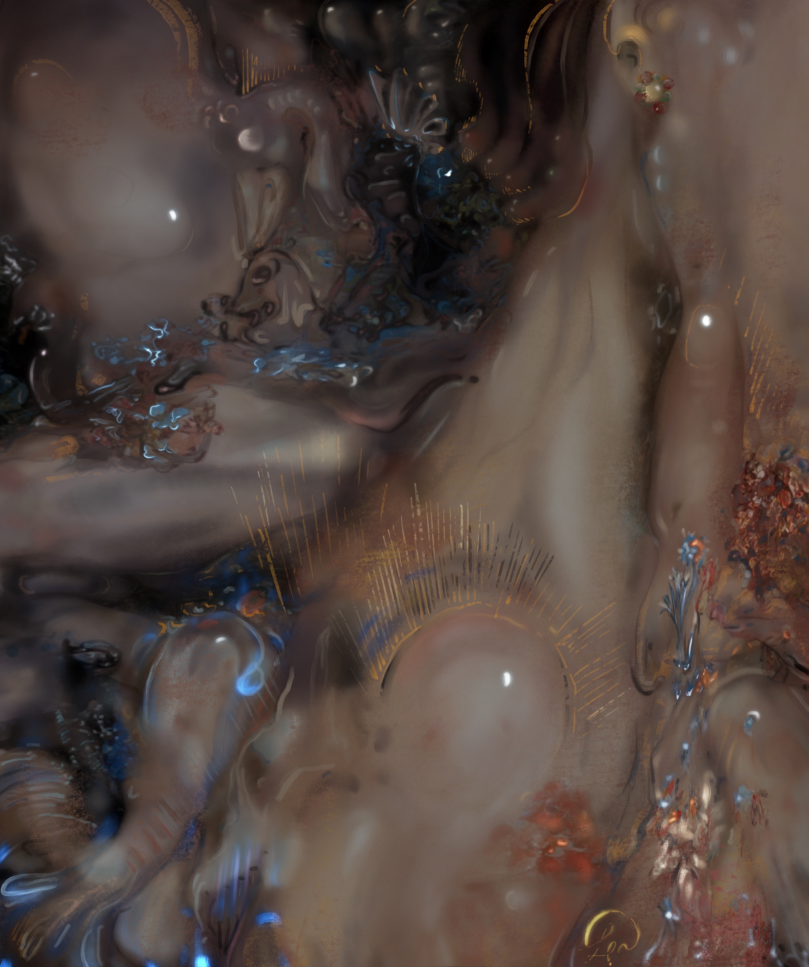 This shows “䷁ Kūn (坤卦),” one of the opening hexagrams, which symbolizes the Earth—its capacity to sustain and embrace. Composed to be read from the upper right toward the left, the work employs flowing liquid forms to evoke an embryonic process of ‘becoming,’ a metaphor for the origin of life. It resonates with the spirit of “the Earth’s virtue carries all things” (厚德载物), expressing the Earth’s nurturing embrace of creation. As “䷁ Kūn” consists of six broken lines (Yin), it embodies a profoundly feminine, gentle, and generative energy.