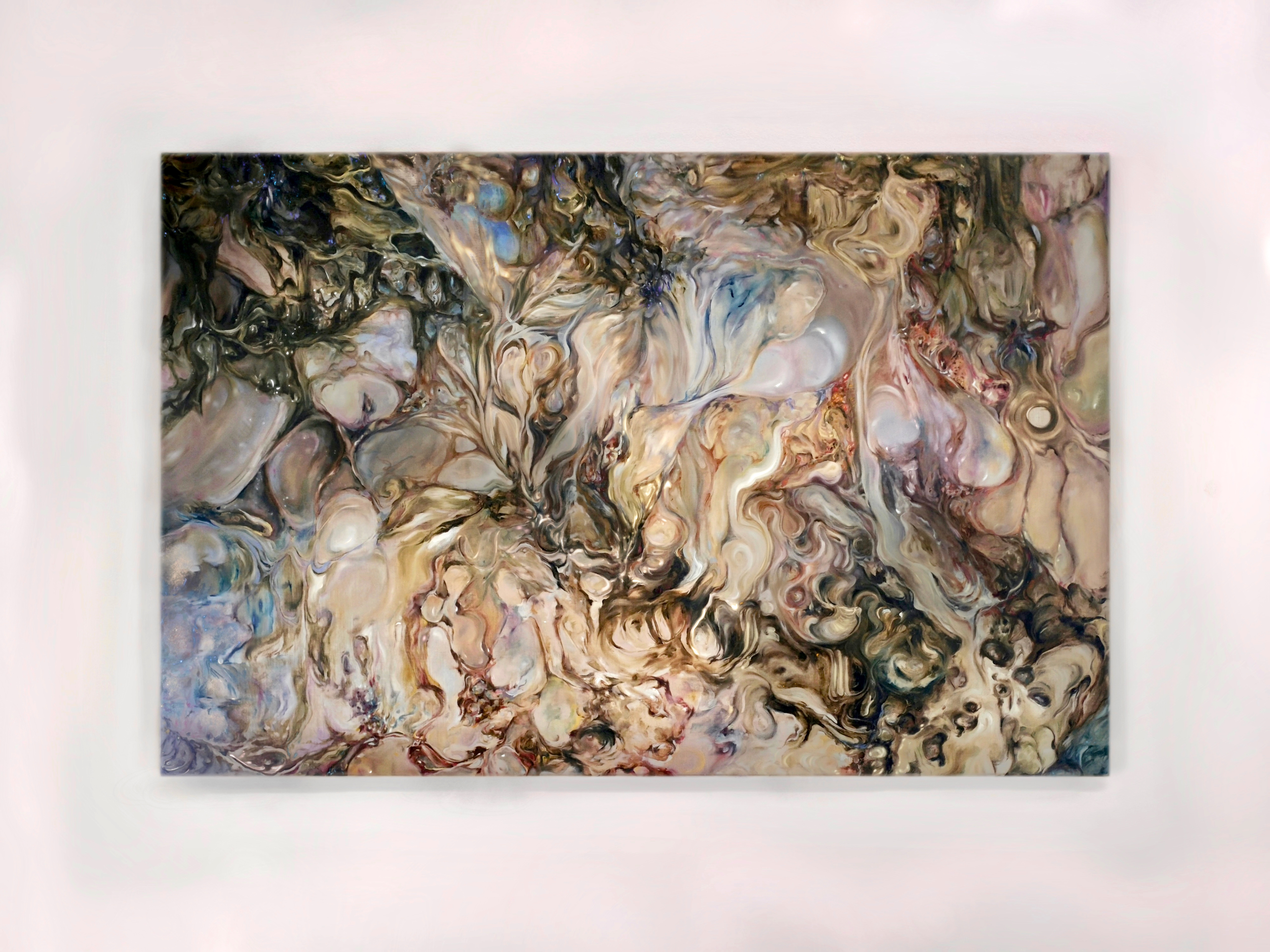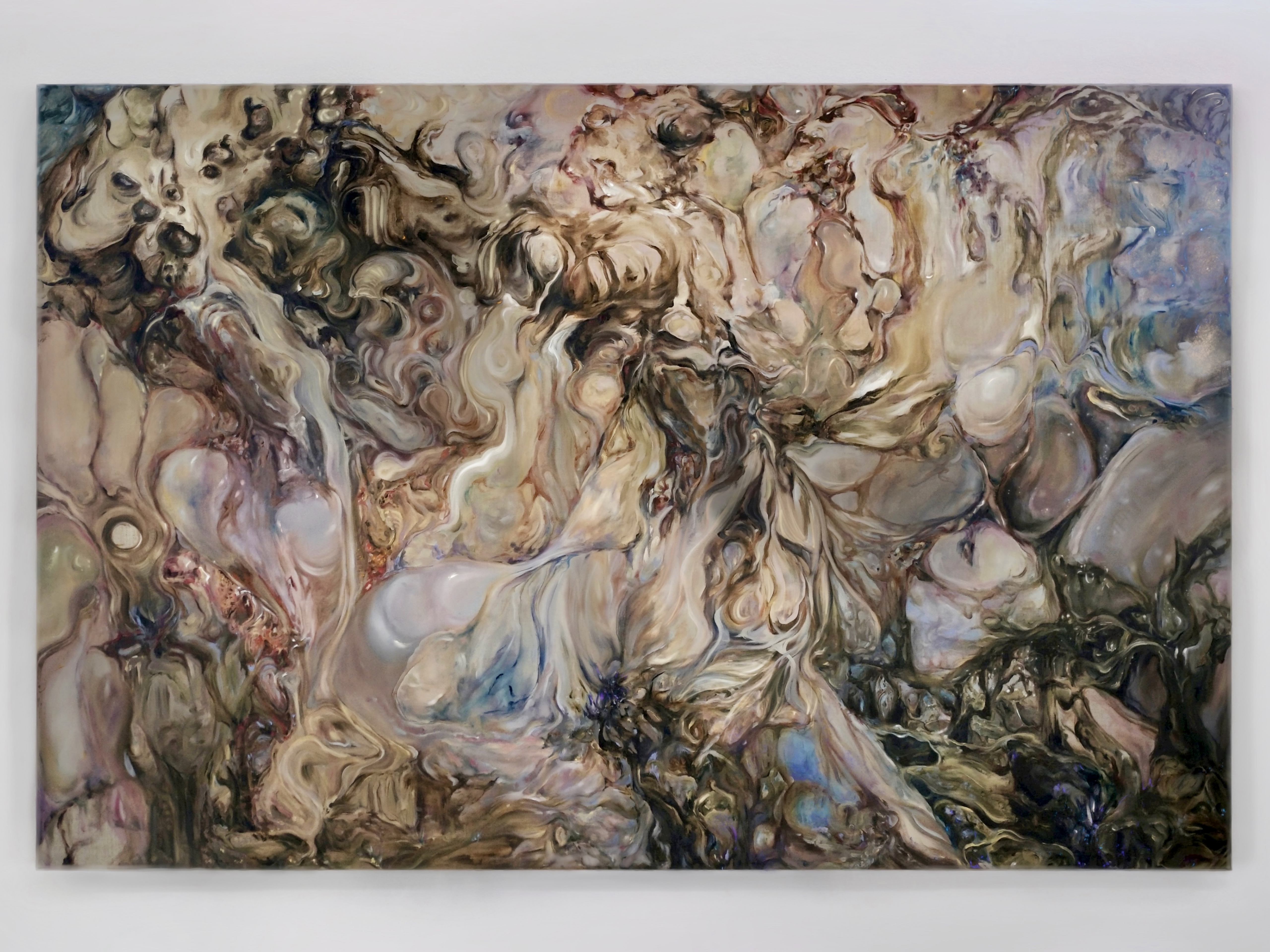 Inspired by Chinese ink, calligraphy and landscape techniques, the artist builds an exceptionally thin oil surface. Water-like layers, vortices, and textures evoke the rotation of “qi (氣)” in thought of Taoism; subtle shifts in tone and light suggest the gathering and dispersal of energy. The work invites audience to go beyond the static plane to a participatory meditation: every act of rotation becomes a reordering of Heaven and Earth, a momentary transformation between Tai (harmony) and Pi (obstruction).